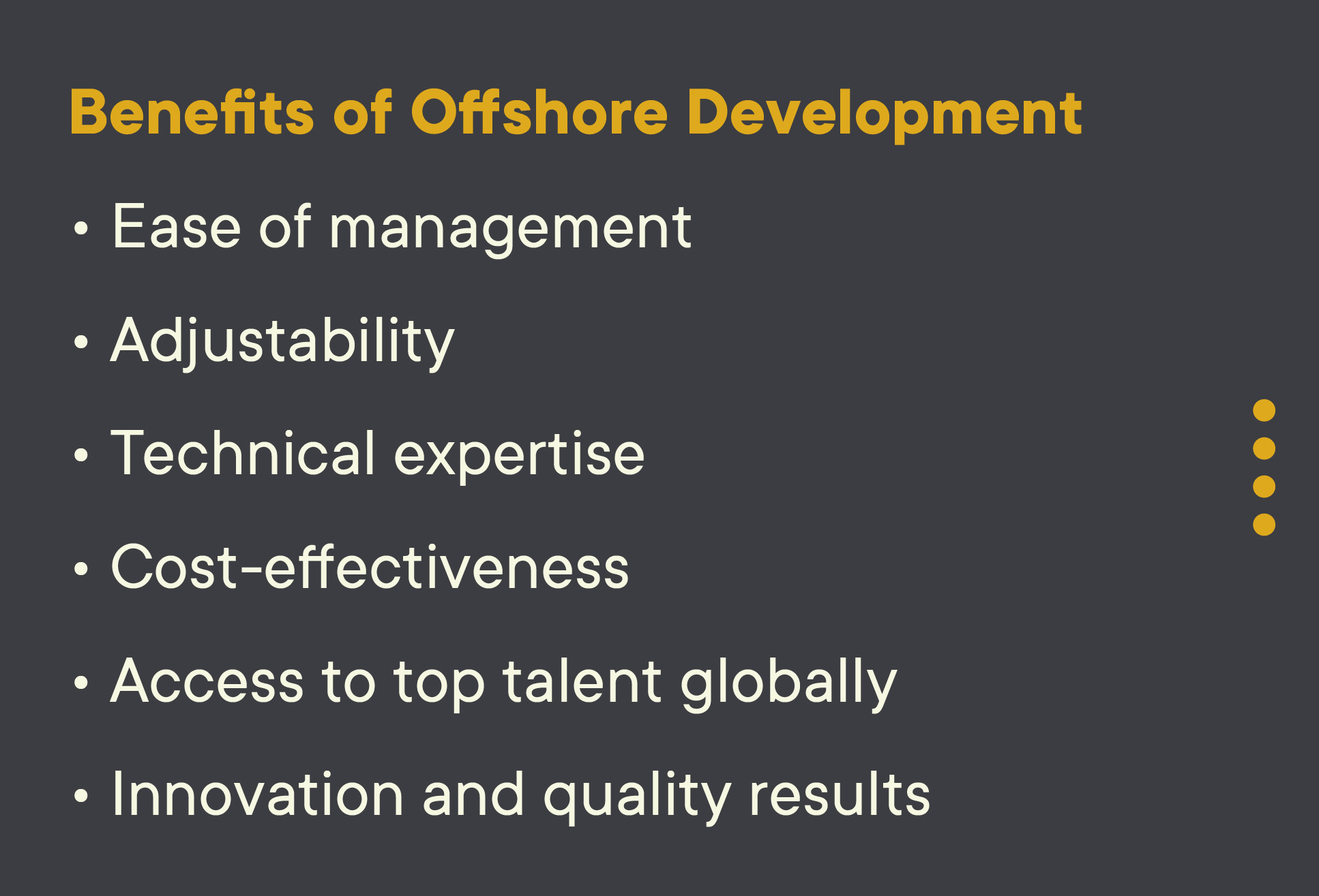Communication-wise, in addition to the possible language barrier, there can also be varying cultural, environmental, as well as behavioral norms that can lead to the disparity. Luckily, the upside to having a dedicated team is that you don’t have to coordinate with or manage each resource, you just need an experienced project manager.