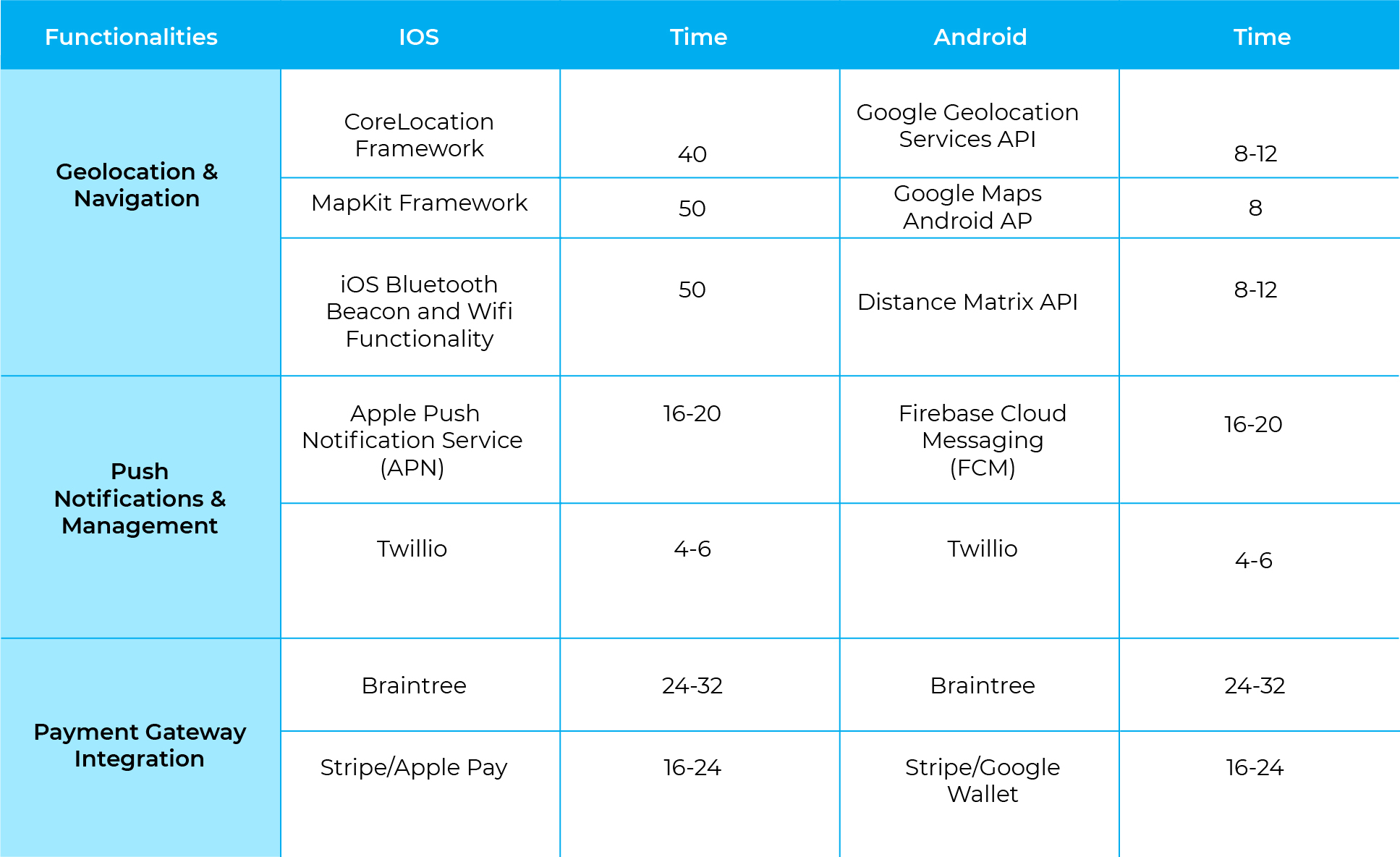 Below is an overview of all technological integration with the time (in hours) taken to develop the following in-app services: