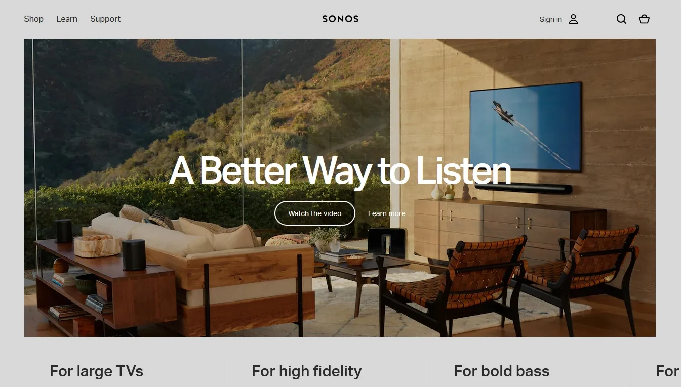 Sonos’ website teaches us that products or services which are technically complex should be rather easier to explain. A producer of wireless sound systems, Sonos lets their product take the center stage with high-value messaging. With a clean design as well as a strong tone of voice, it’s evident that they understand their audience and know how to pose their product to their audience quite well.