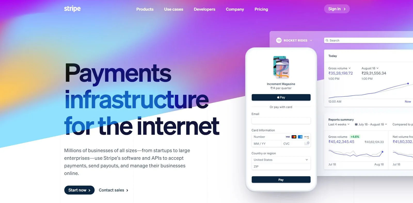 When you visit Stripe’s website, you’re instantly drawn in with a headline, “Payments infrastructure for the internet”. The copy hits the brand’s offer and core value in 4 simple words. The explanation that follows up describes who the service is for (online businesses) and what it does (handles high traffic online payments, regardless of the size of your company).