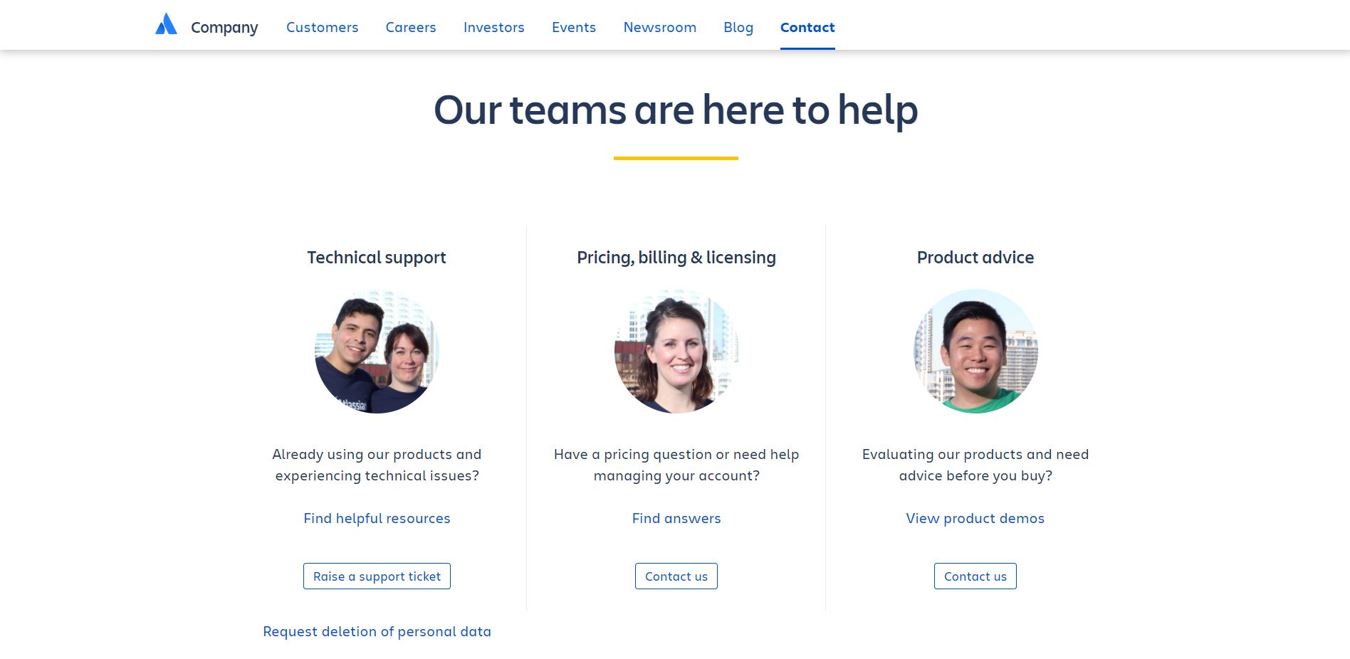 - Lastly, the Contact page is an easy way for your visitors to get in touch with your business. A well-designed contact form should be easier for your audience to engage with as well as make a long-lasting impact. For example, look at how enterprise software company Atlassian does this. With an extremely cleaned and well-organized contact page, they make it easy for visitors to find the specific department they’re looking for and reach out.