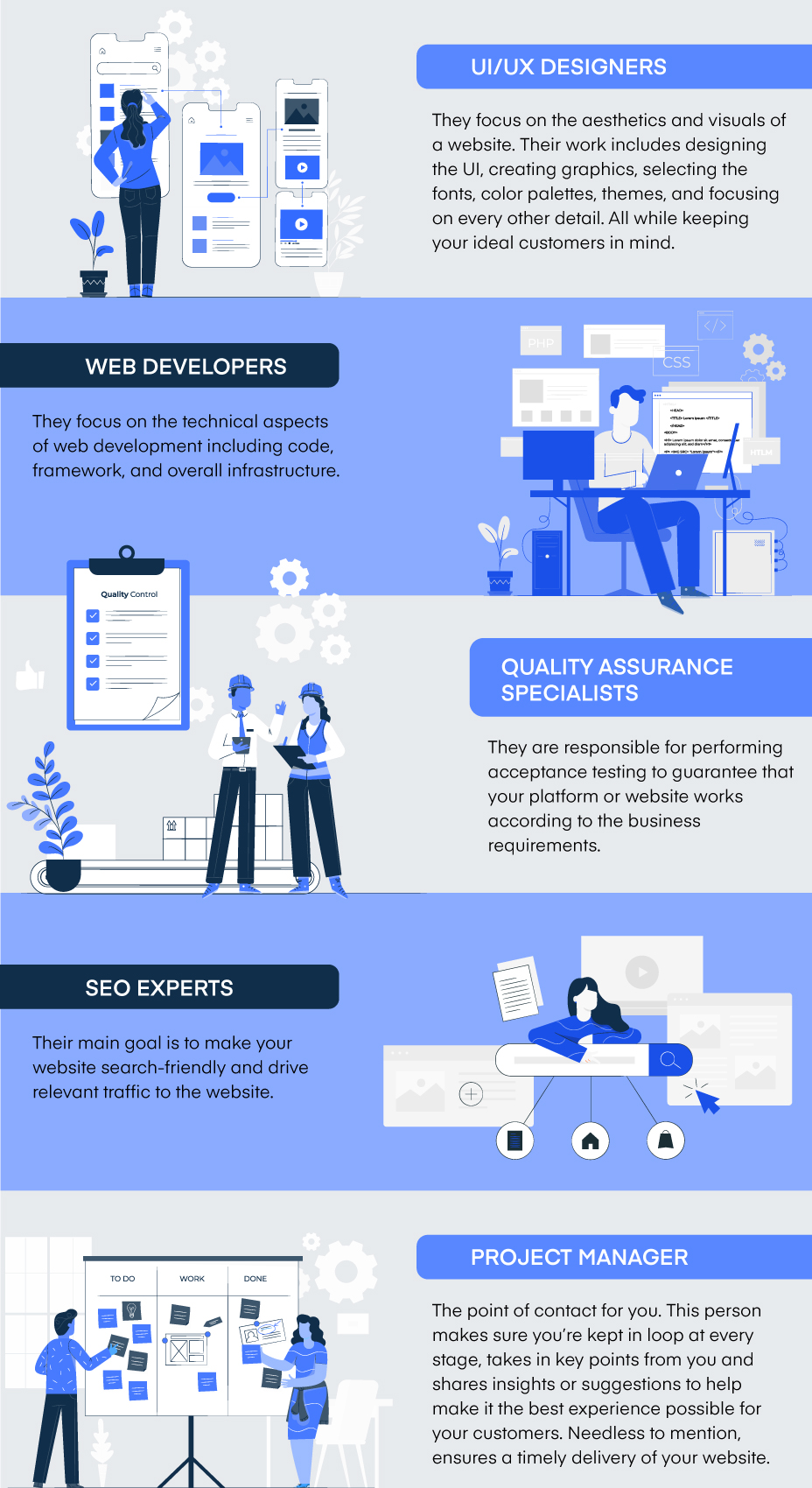 A web development company comes with a varying number of professionals working under different aspects of developing a website. All with one aim – to build a high-quality, highly converting website for your business. Here is the list of professionals you join hands with when outsourcing web development: